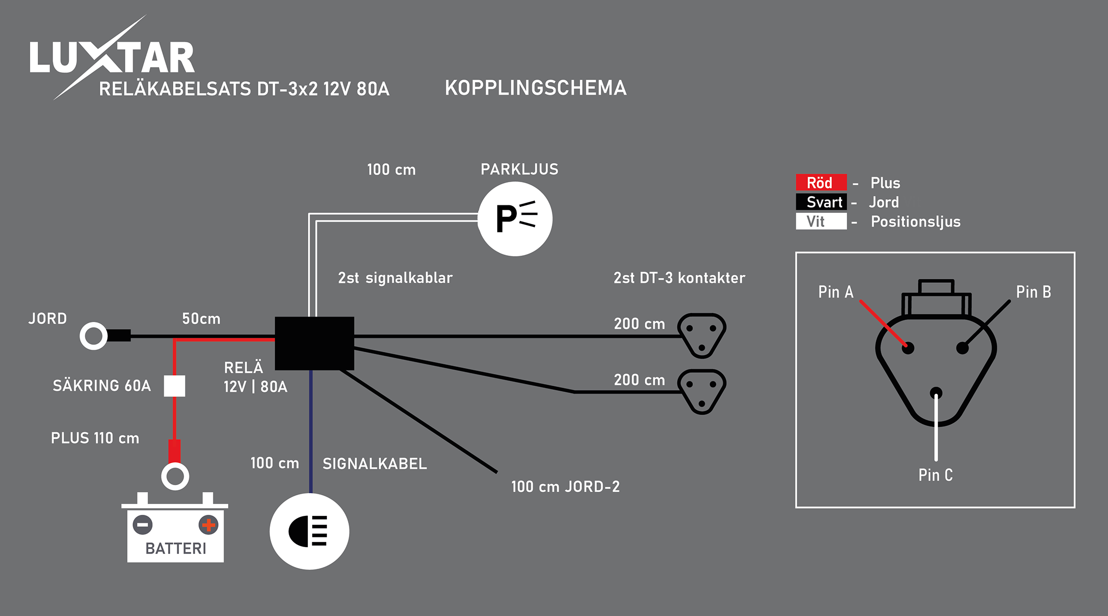 Luxtar Reläkabelsats DT-3 X2 | 12V | 80A Relä