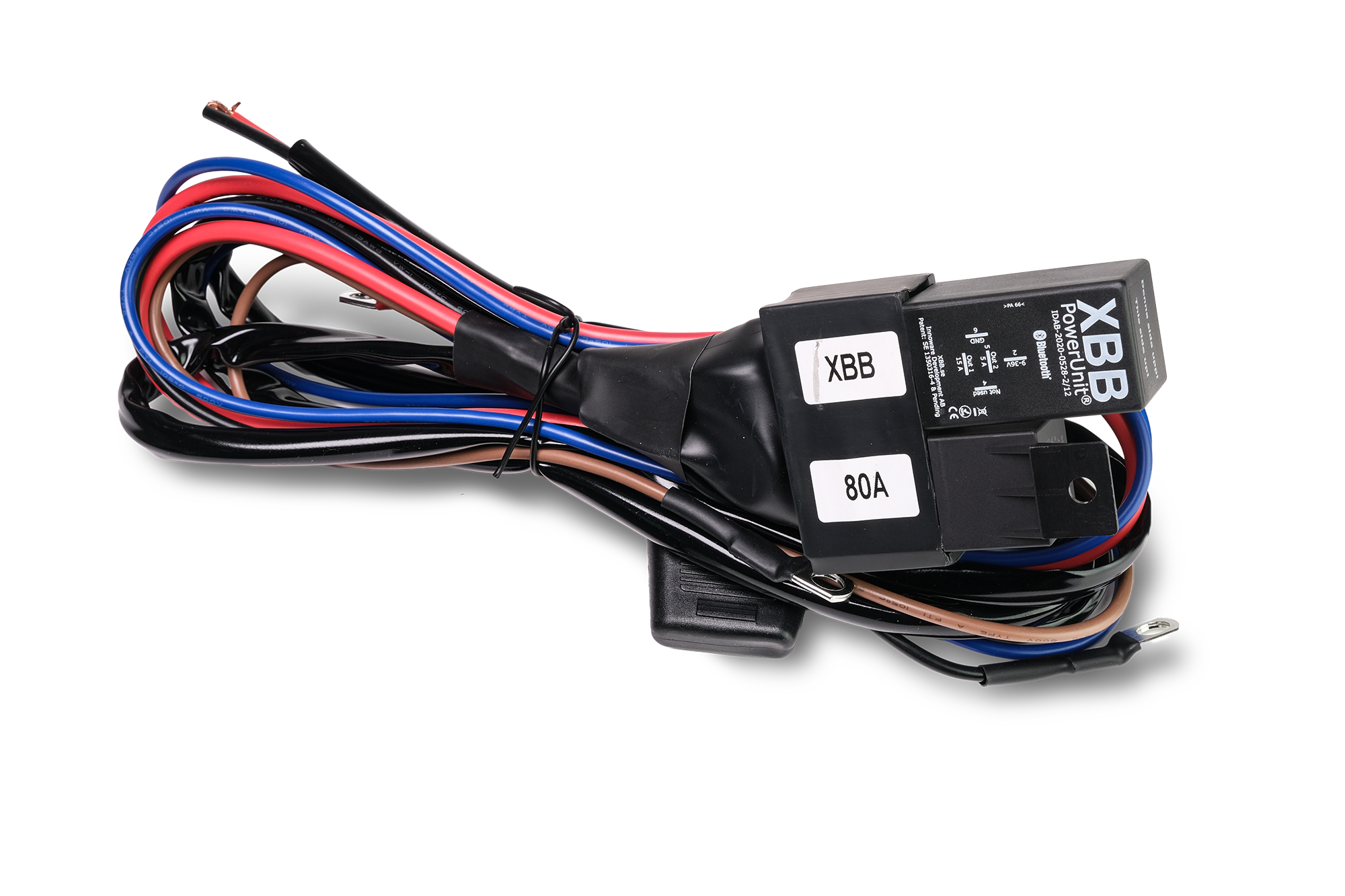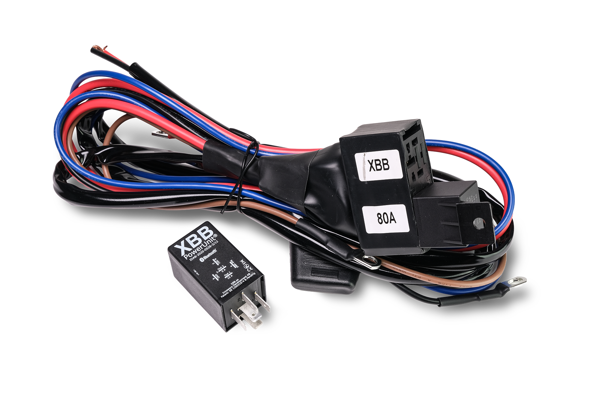 De XBB PowerUnit stuurt het relais aan via uitgang 2 (5A), wat op zijn beurt de extra verlichting activeert.