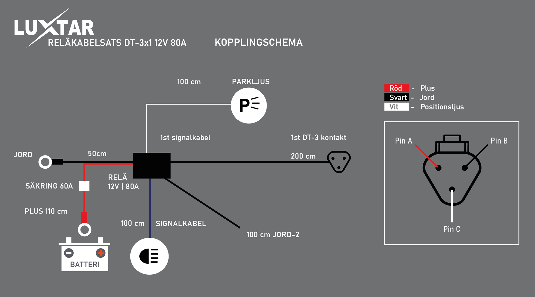 Luxtar Reläkabelsats DT-3 X1 | 12V | 80A Relä