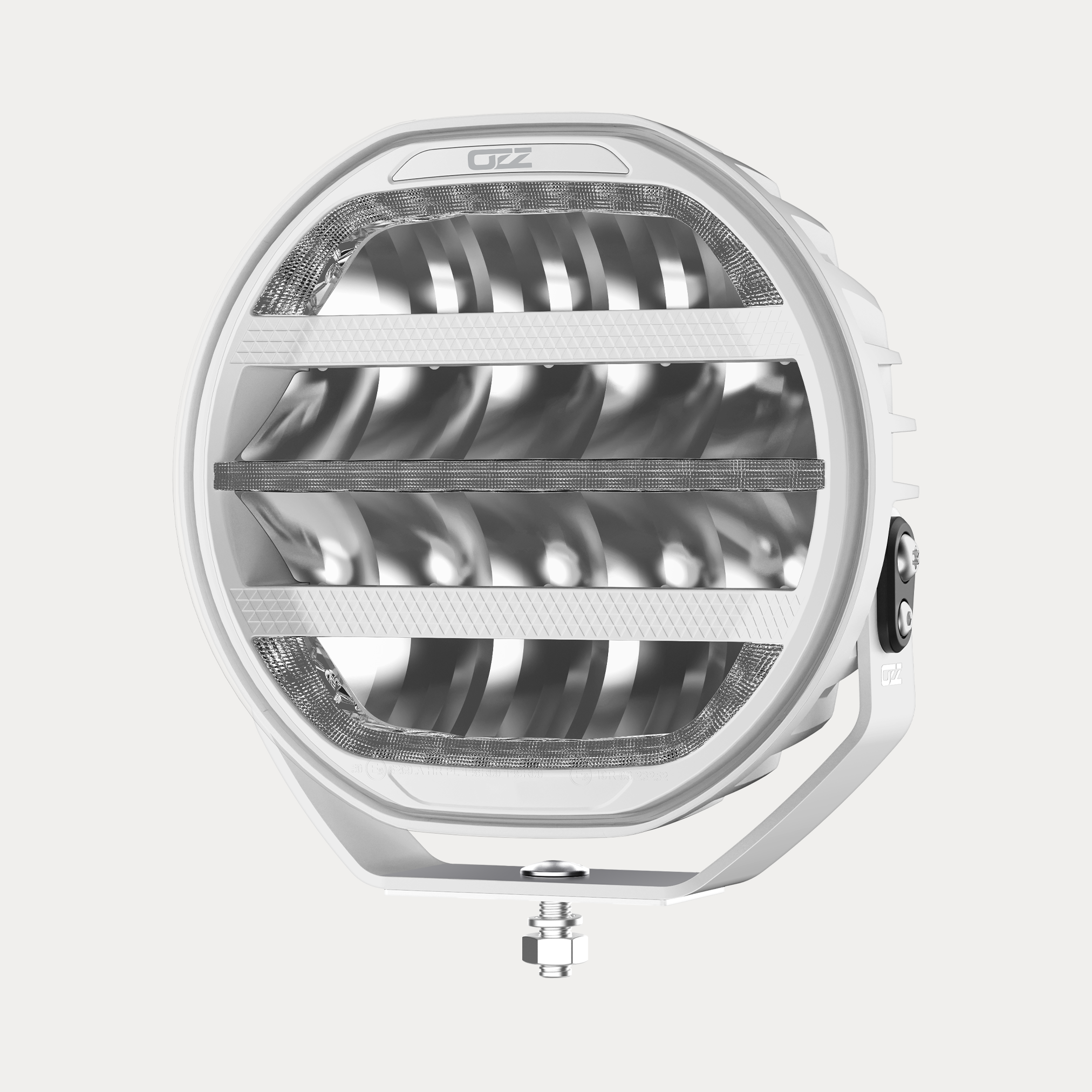 Helvitt 9” extraljus från OZZ med 10 424 lumen, dynamiskt positionsljus och integrerat varningsljus. Perfekt för både väg och terräng.